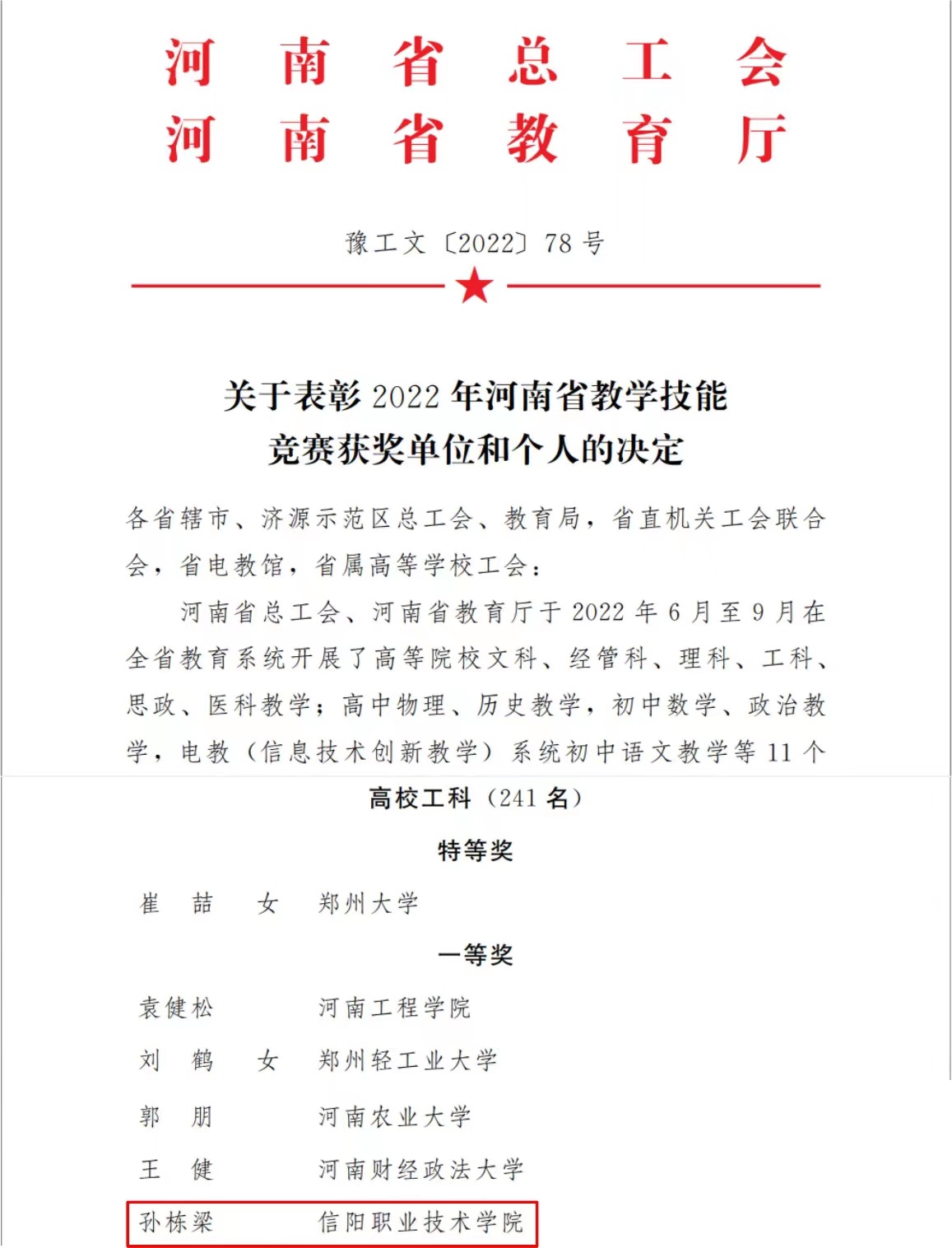 2022年9月16日,由河南省总工会、河南省教育厅主办,河南省教科文卫体工会以及洛阳理工学院承办的河南省教育系统2022年度教学技能竞赛(现场决赛)落下帷幕。信阳职业技术学院开云体验官网入口教师孙栋梁进入决赛,荣获高校工科组一等奖,被授予“河南省优秀教学标兵”荣誉称号。