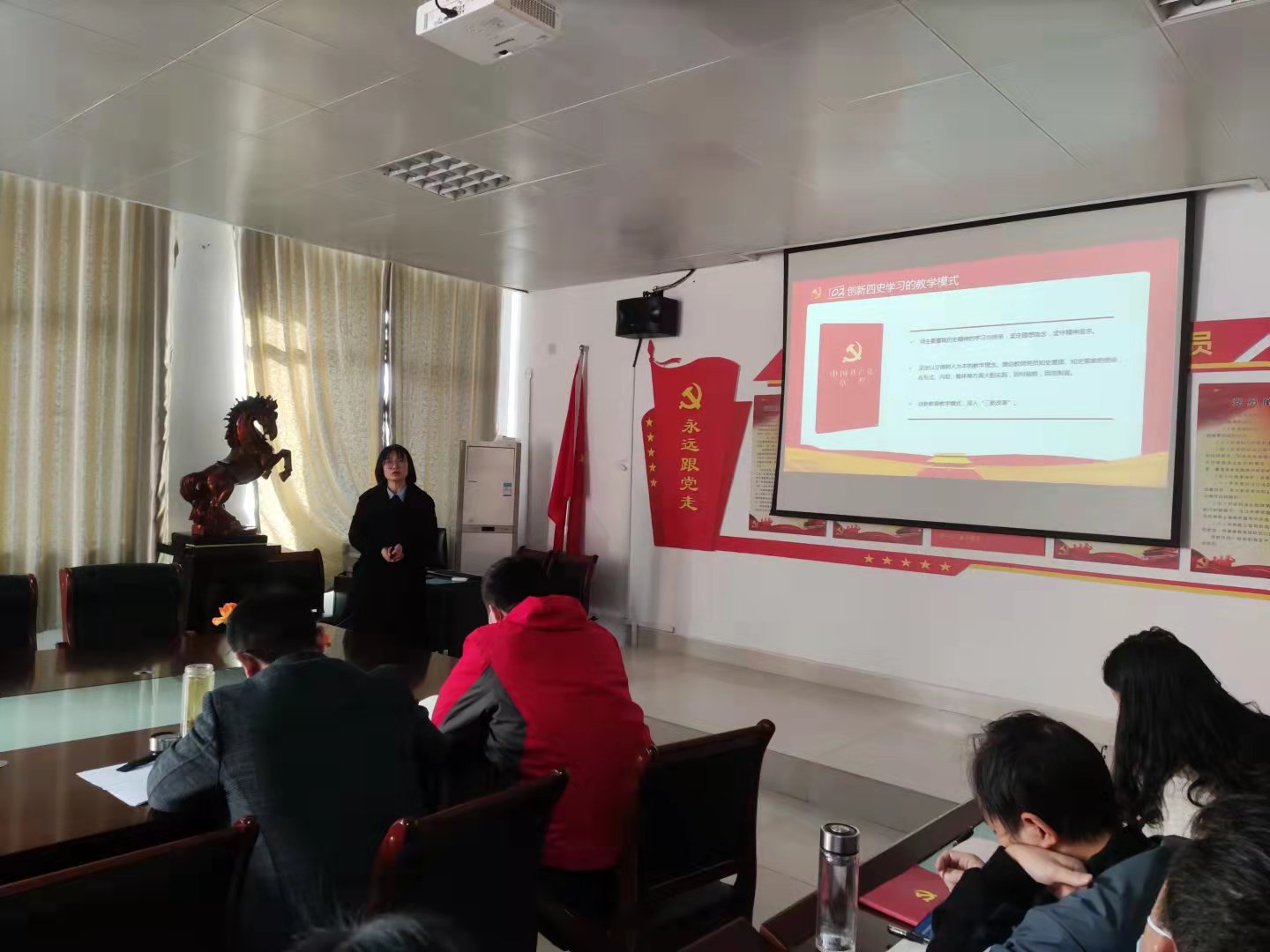 王平俊从“四史学习的内涵意义”、“创新四史学习的教学模式”、“搭建四史学习的实施桥梁”、“探索新时代高校教师使命担当的实施路径”和“明确新时代高校教师核心素养发展方向”五个方面详细进行了剖析。同时,王院长指出:作为党员,要积极认真学习“四史”,要重视历史精神的学习与传承,坚定理想信念,坚守精神追求。坚定立德树人和以人为本的教学理念。同时,创新教育教学改革模式,深入“三教改革”。培养德智体美劳全面发展的社会主义建设者和接班人,为中华民族的伟大复兴而不懈奋斗!